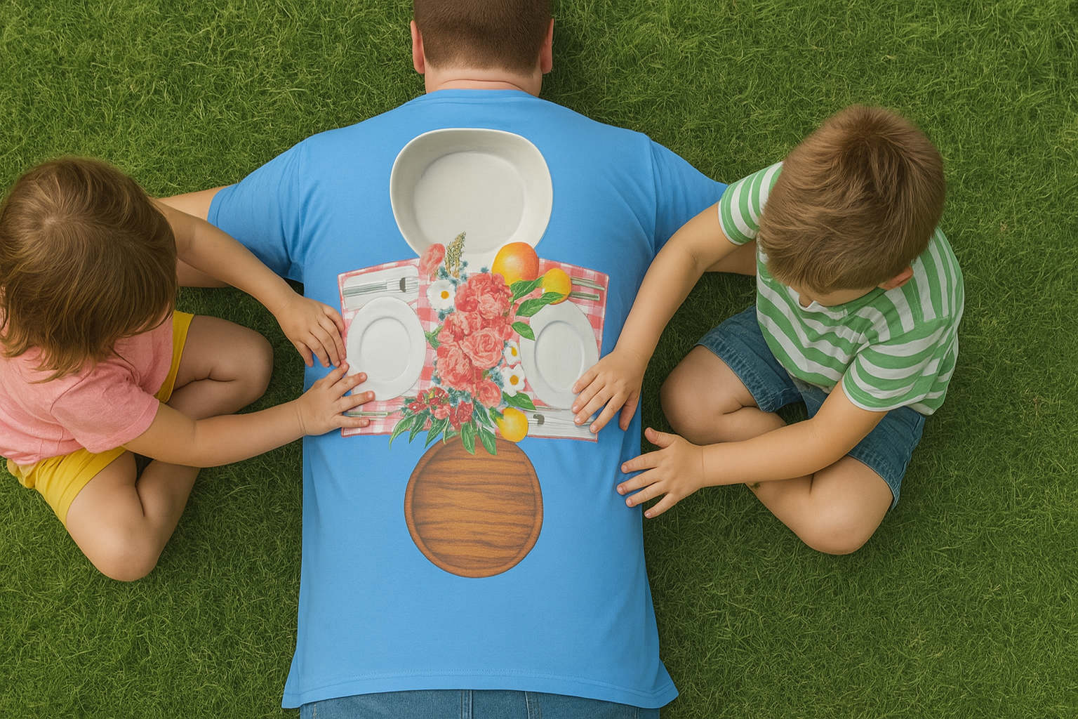 Finally—a picnic you don’t have to pack. Just lie down and let the kids set up their imaginary feast on your back. This shirt turns your horizontal state into peak parent engagement.